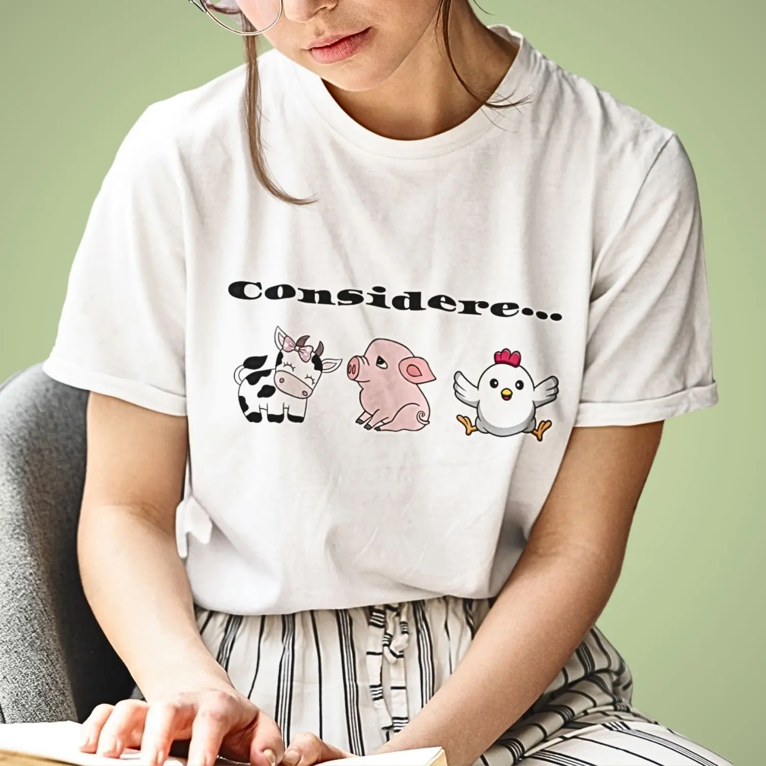 Feita para quem se importa, a Camiseta Considere ser Vegano traz frases e imagens que expressam amor pelos animais e respeito pelo planeta.